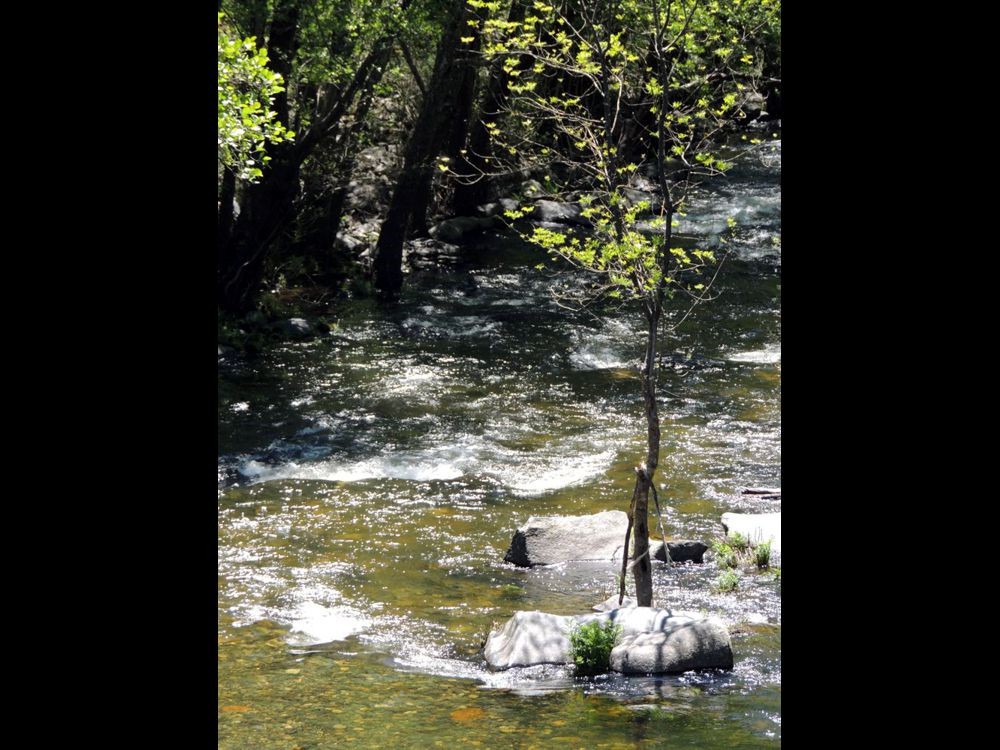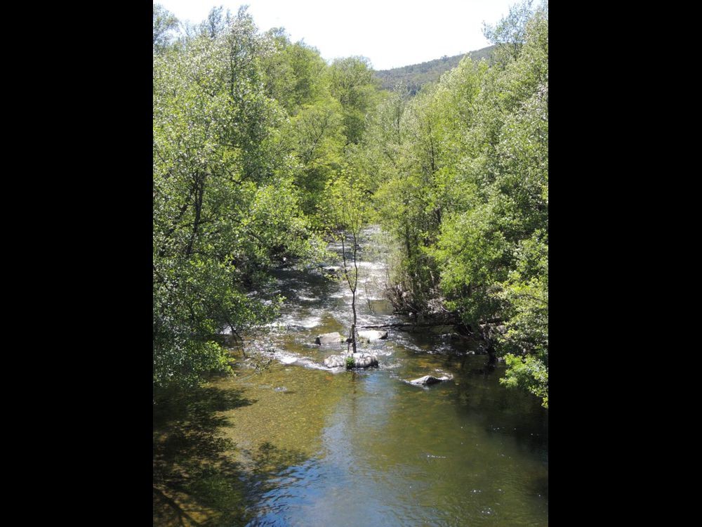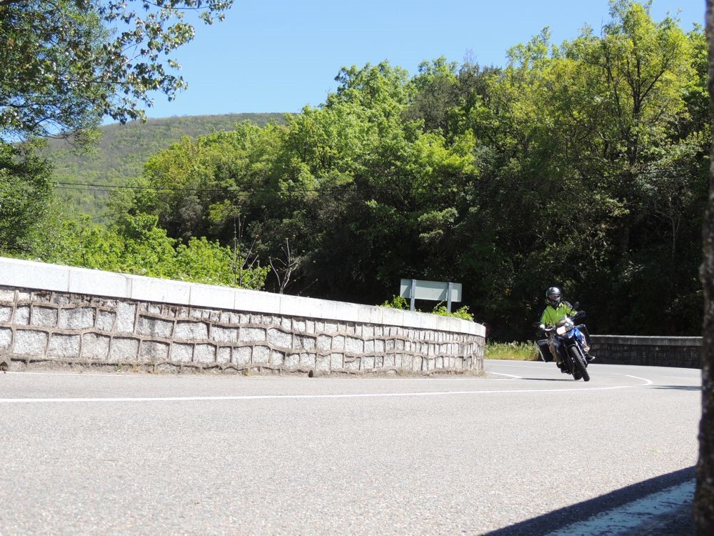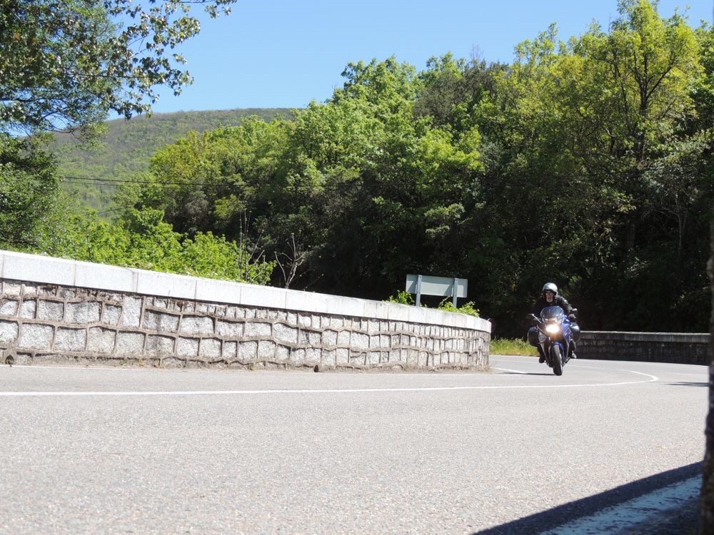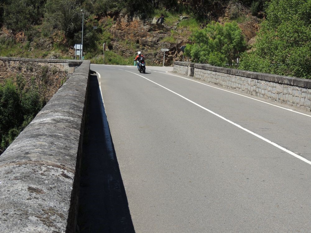 My quiet walk led me down what might have been the old road along with the old bridge. As I ambled down what was now basically a gravel path, I came across some buildings.. one crumbling and abandoned, one which likely was still occupied but cut off from the bustle of the main road and one across the river (Alagon) which (if occupied) was likely an apartment building of some kind. The sound of the river was louder there... there were some rapids just past the old bridge. So... while the rest of the group had their meal in the Restaurante El Pipero, I sat on the old bridge and watched the currents... VERY relaxing! When I knew they would likely be getting ready to leave the restaurant, I travelled back up the road to the newer bridge and decided I would be able to take pictures of the group as they crossed the bridge. Sergi obviously had the same idea because he joined me just before everyone started up their bikes. Even though I've taken pretty decent pictures of moto riders (MotoGP), I found it hard to time the photos just right... after all, if you don't get a good shot of a particular rider in MotoGP, they'll be coming past you again on the next lap... each person in our group just passed me once! :)