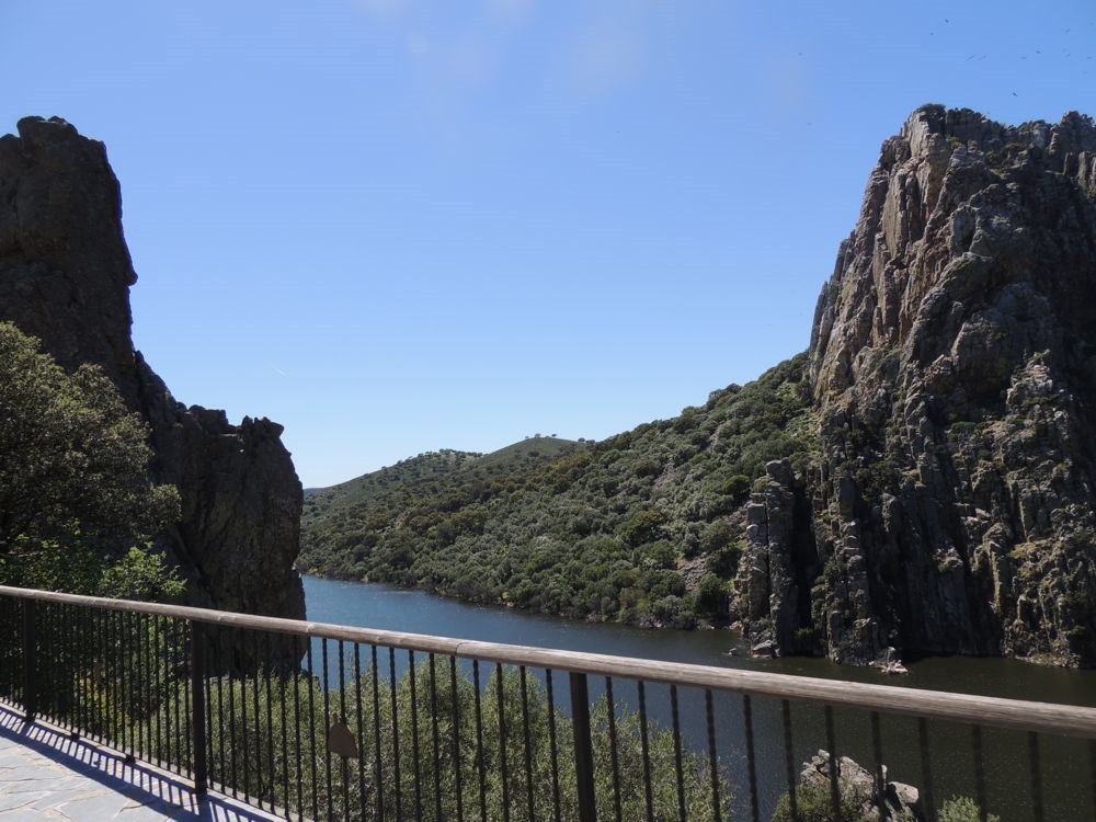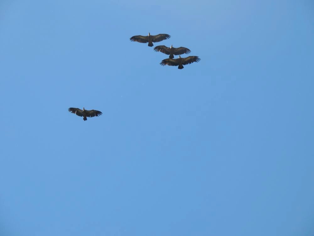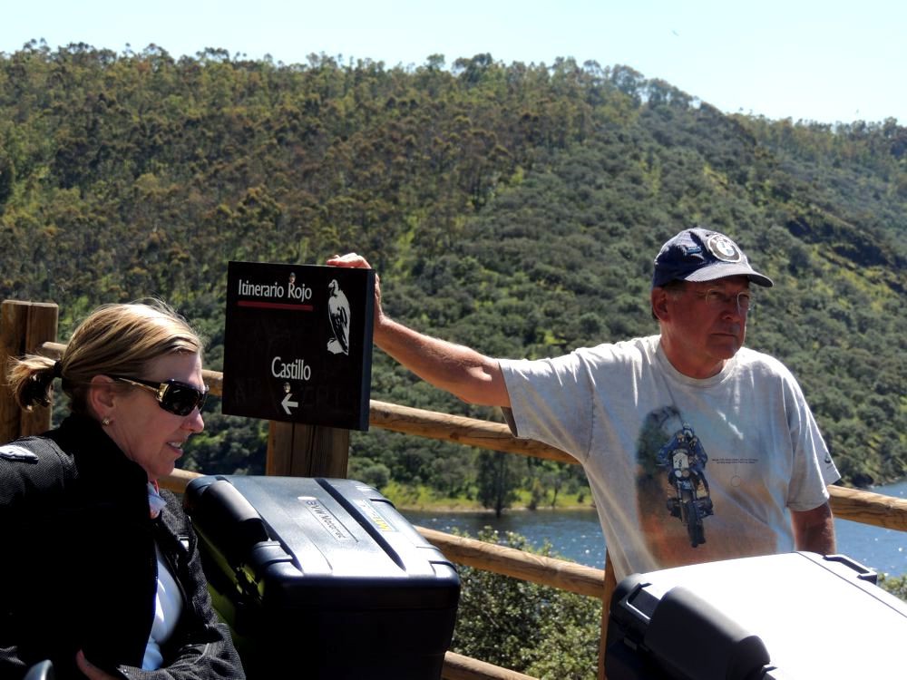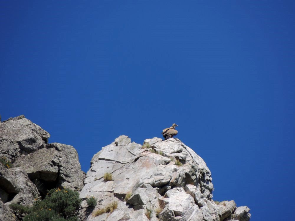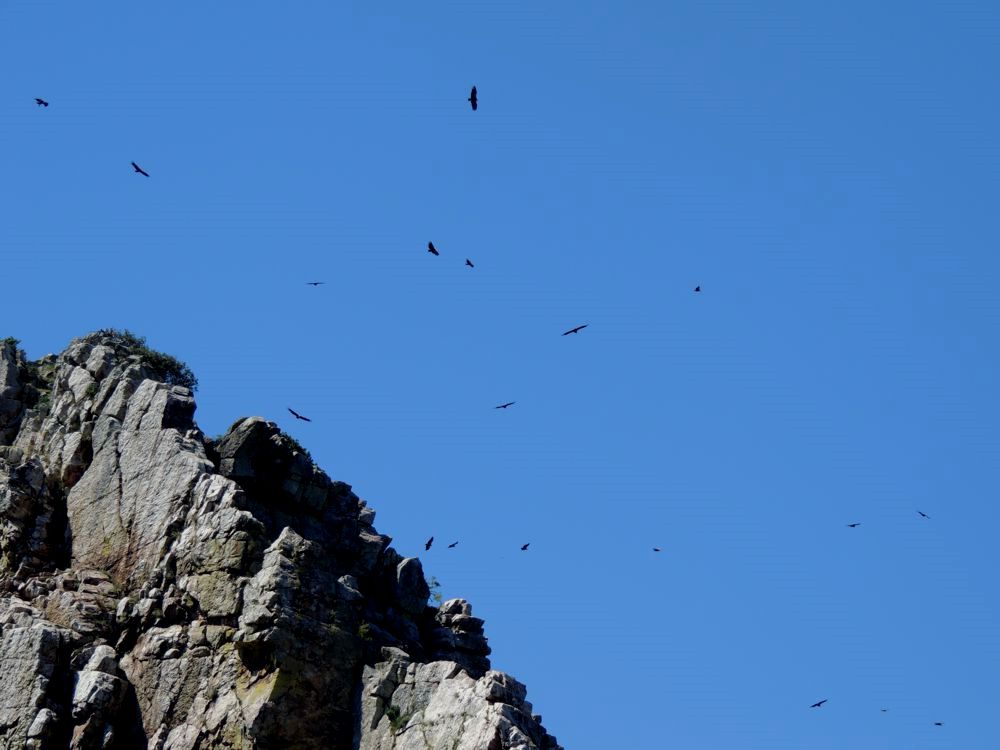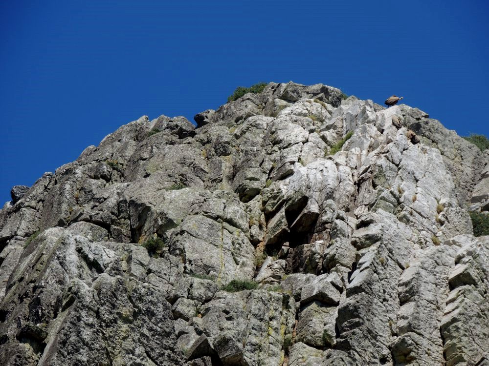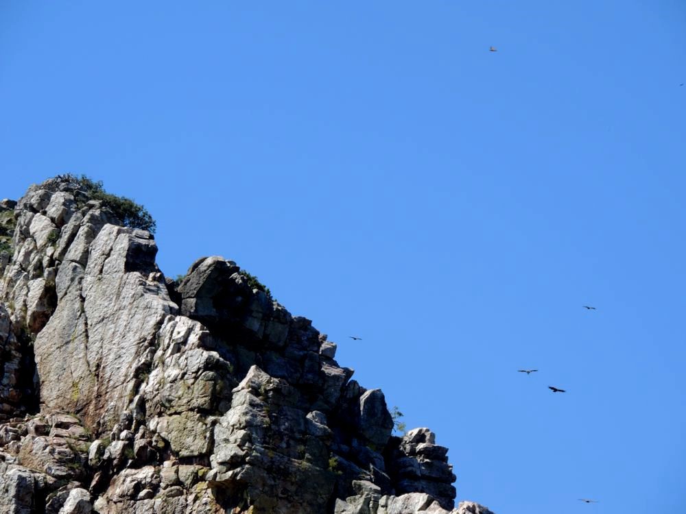 We stopped at Salto del Gitano (a rockface) on the side of the road (EX208) in Parque Natural de Monfrague to see the BIG birds. According to a website I found, birdwatchers come to this area to see many types of birds but predominantly the vultures and eagles. Martin told us of how on one occasion, he went around a corner of the road only to come across several of the HUGE vultures feasting on a dead animal on the road. He told us how the birds were as big as shoulder height? It sounded like the encounter kind of creeped him out. Understandable. It was interesting to see the multitude of birds flying above us... some in formations! Those appeared to be eagles because their necks were of not overly long the way a vulture's would be. There was a large vulture at the top of a set of rocks across the road from where we parked. I snapped several pictures of him as he groomed his feathers.