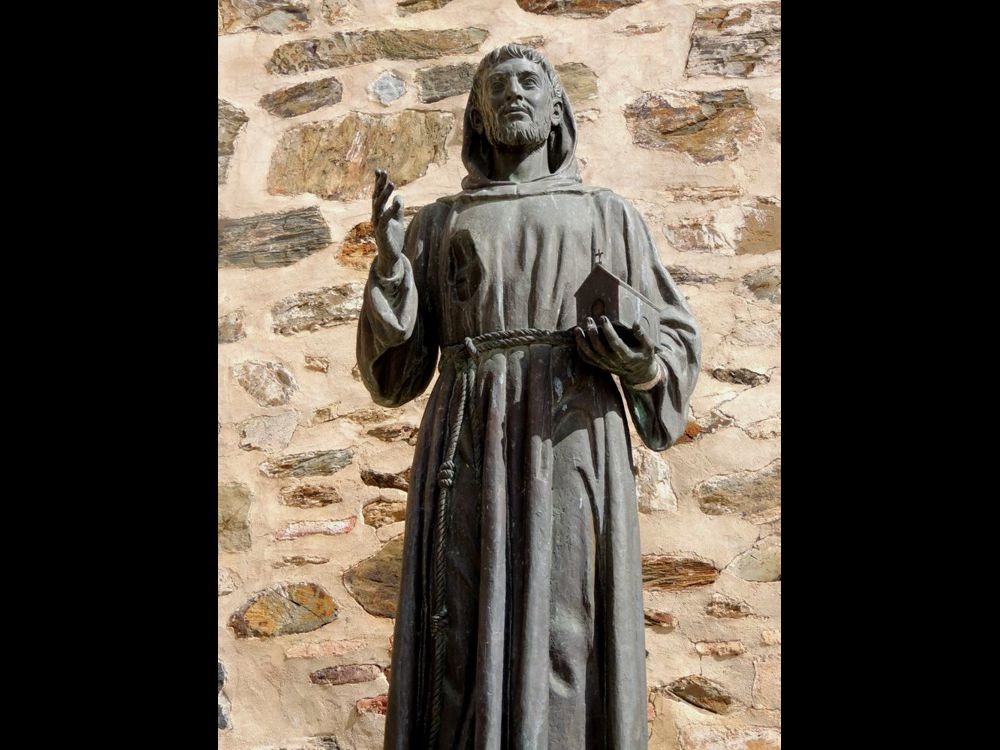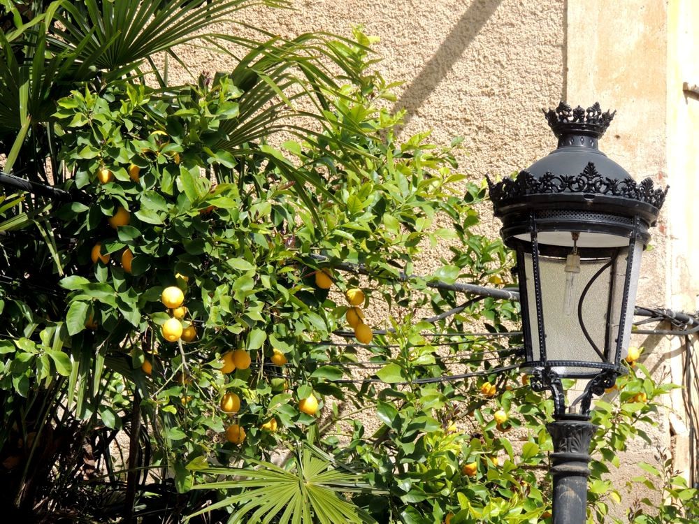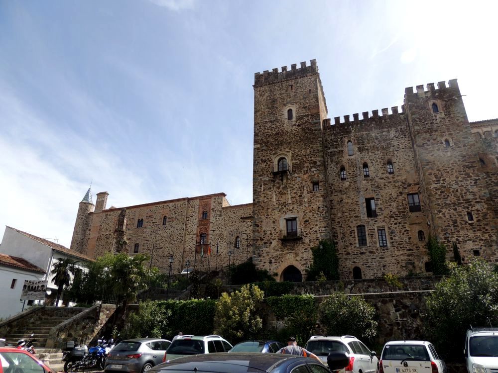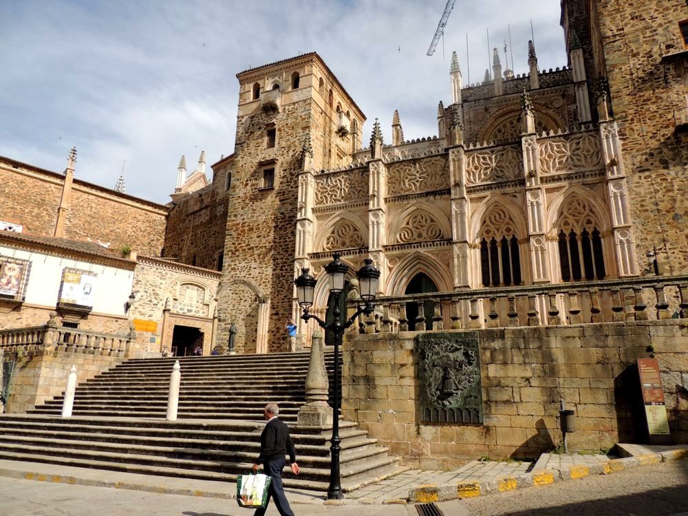 View of the Monastery from the Plaza de Santa Maria de Guadalupe was awesome. What a beautiful building! I did a brief tour of the surrounding neighbourhood. Some but not all of the shops were open. It was interesting to notice that a bullfight to be held in Trujillo (where we'd just left) was being advertised near several of the buildings. After buying a small souvenir, I climbed the stairs to the front doors of the monastery. You could not get in that way. There was an entrance at the side. There wasn't a lot of time left before we had to be back at the bikes so when I learned that there was an entrance fee, I passed. Instead, I explored the gift shop and looked at an inside courtyard. Once outside, I continued my walk around the Monastery (and back to where we'd parked by going down Av. Alfonso Onceno. There was a terrific view up, up, UP one of the towers from there. It certainly was a cozy little neighbourhood!