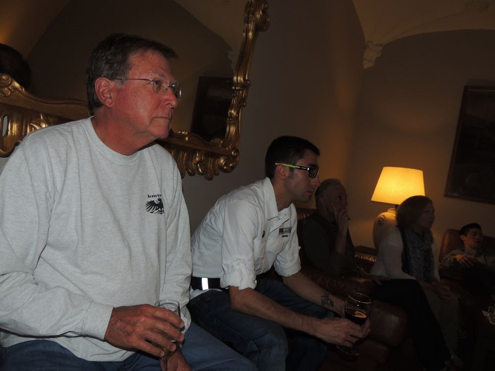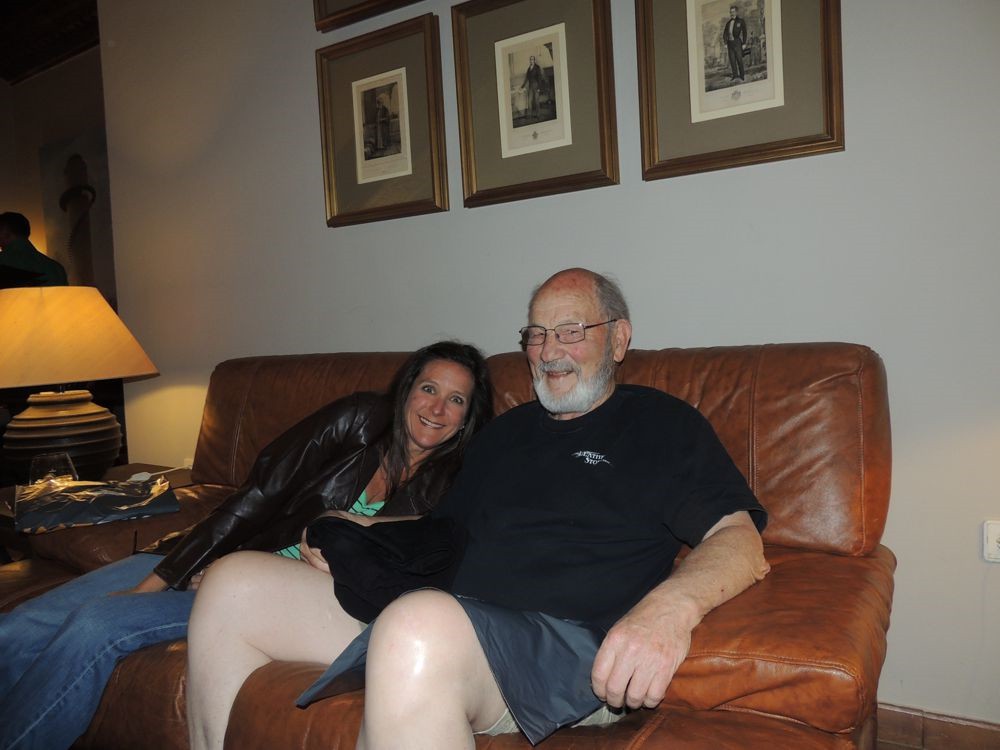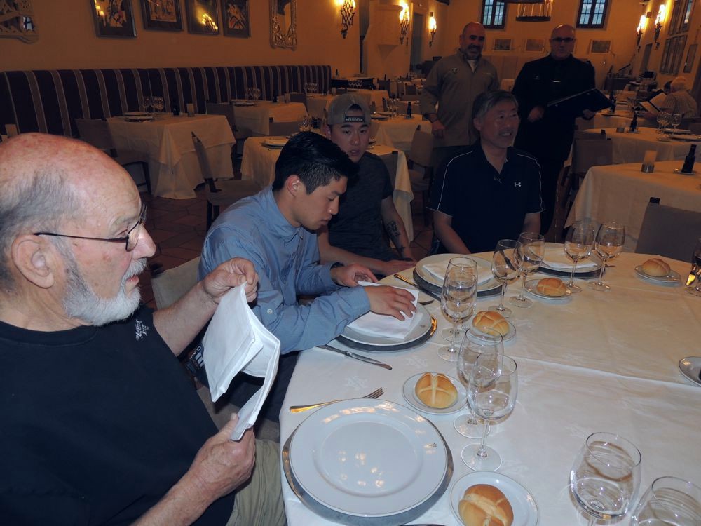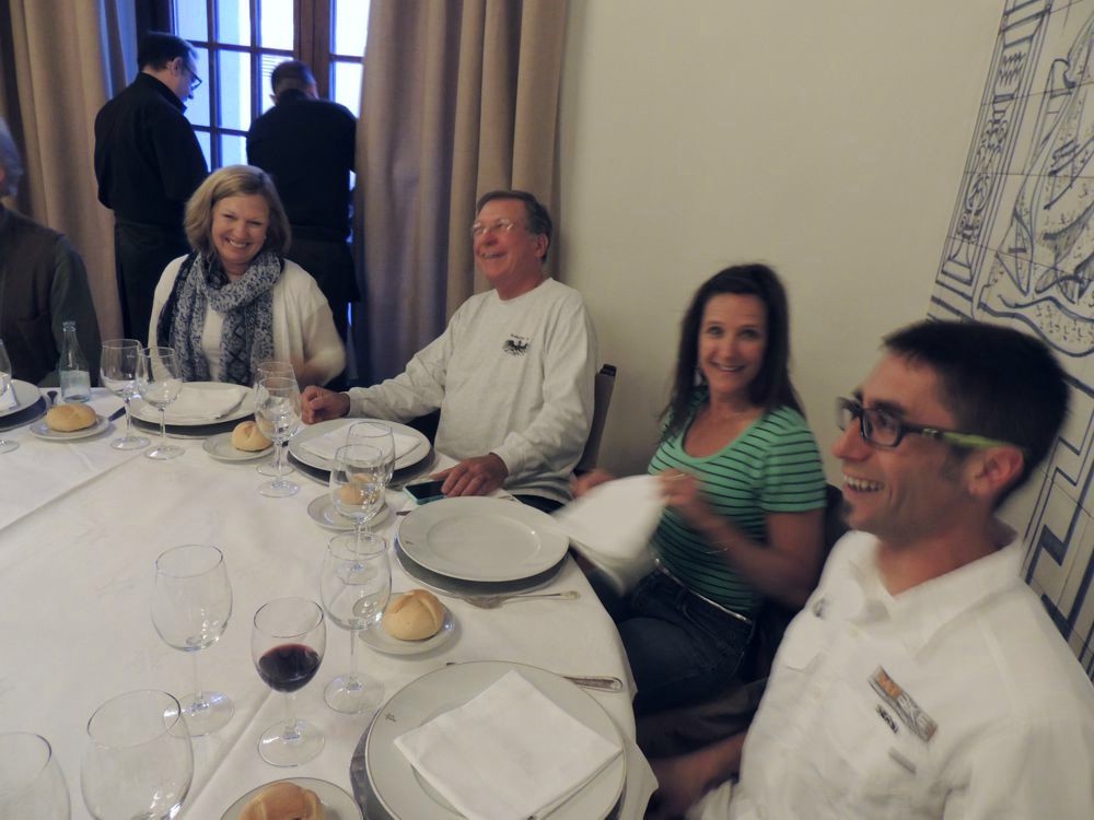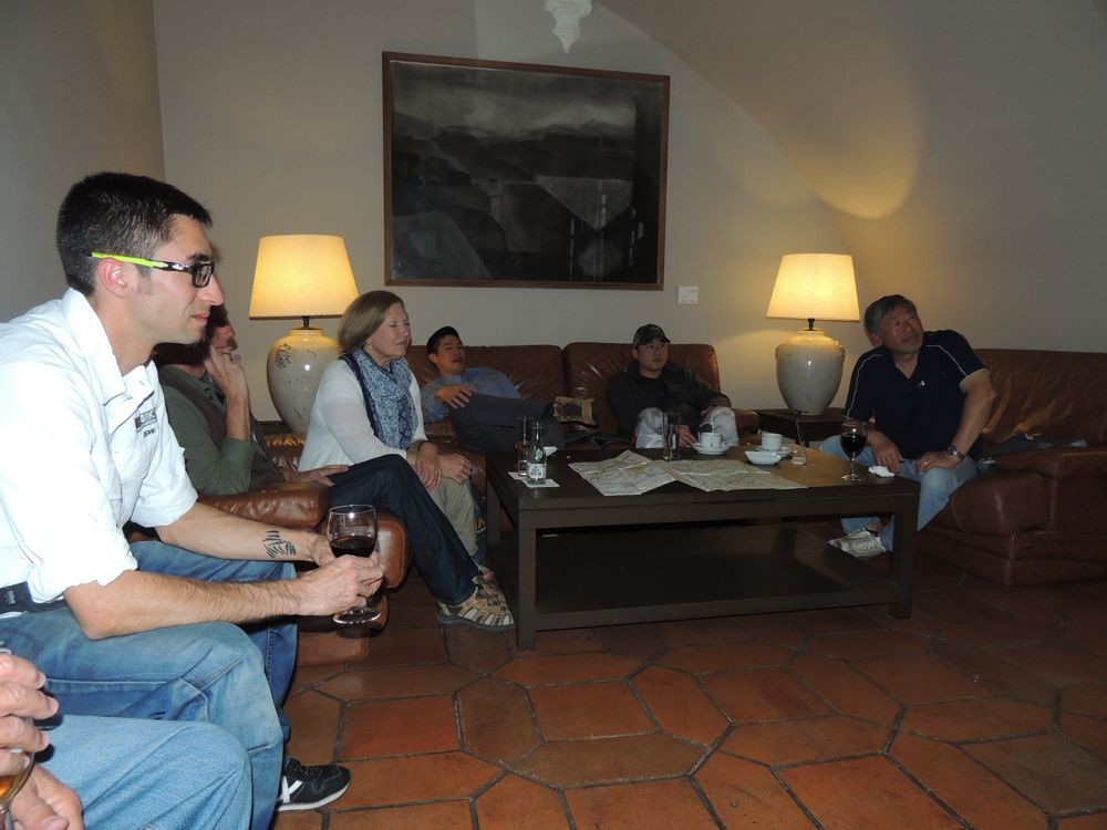 Now back at the parador, it was time for our evening briefing. We held it in the lounge just outside the bar because the bar was full. T'was more comfortable in the cushy chairs anyway!! We got another set of gifts... this time an IMT t-shirt. Afterwards, we went straight to dinner. Paul was feeling better by this time so he ate a little but unfortunately, Chuck was now the one who was sick. He missed both the meeting and dinner. Too bad since dinner was excellent. I was outside talking to an English couple who had moved to Scotland (or was it the other way around??) when the night walkers came out so I was able to snap photos of all.