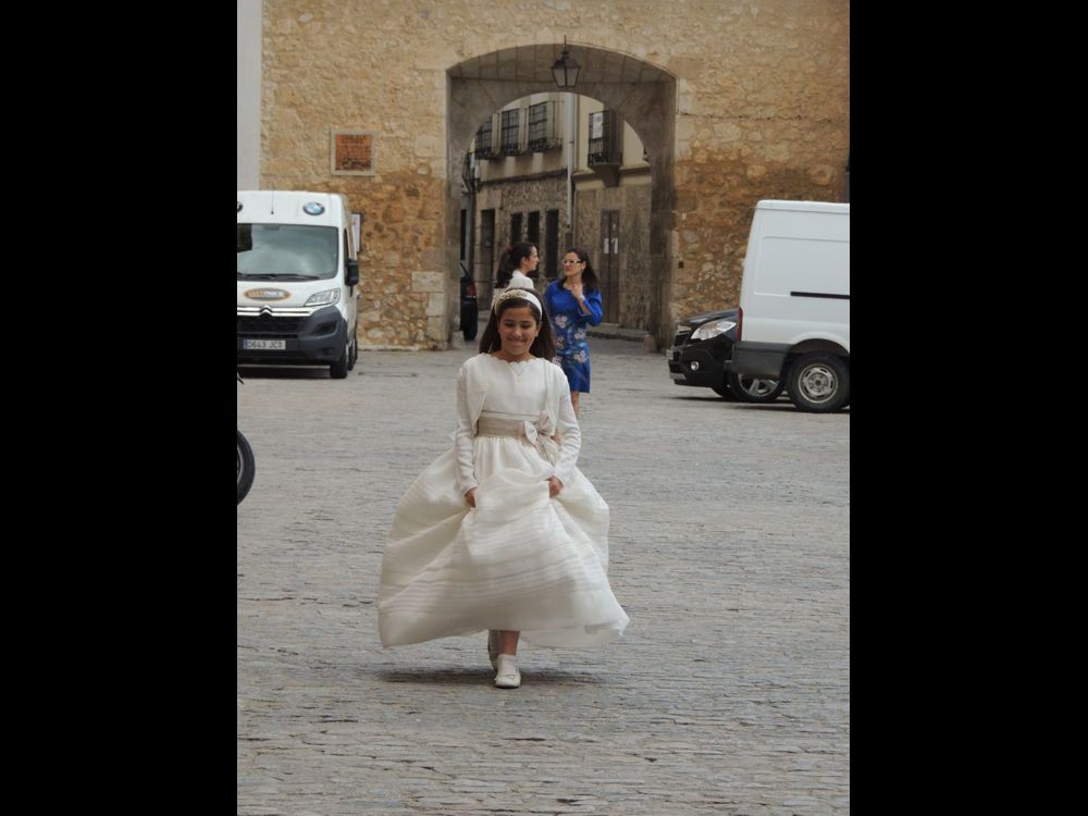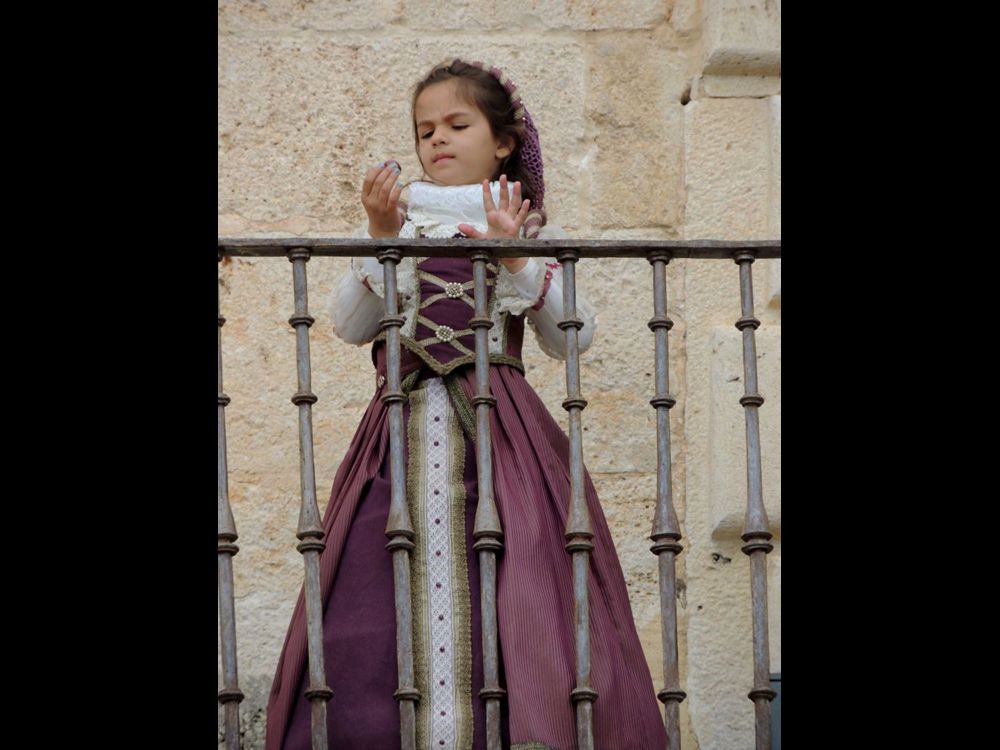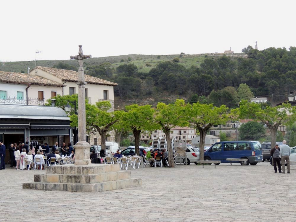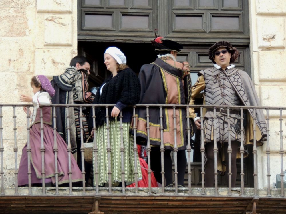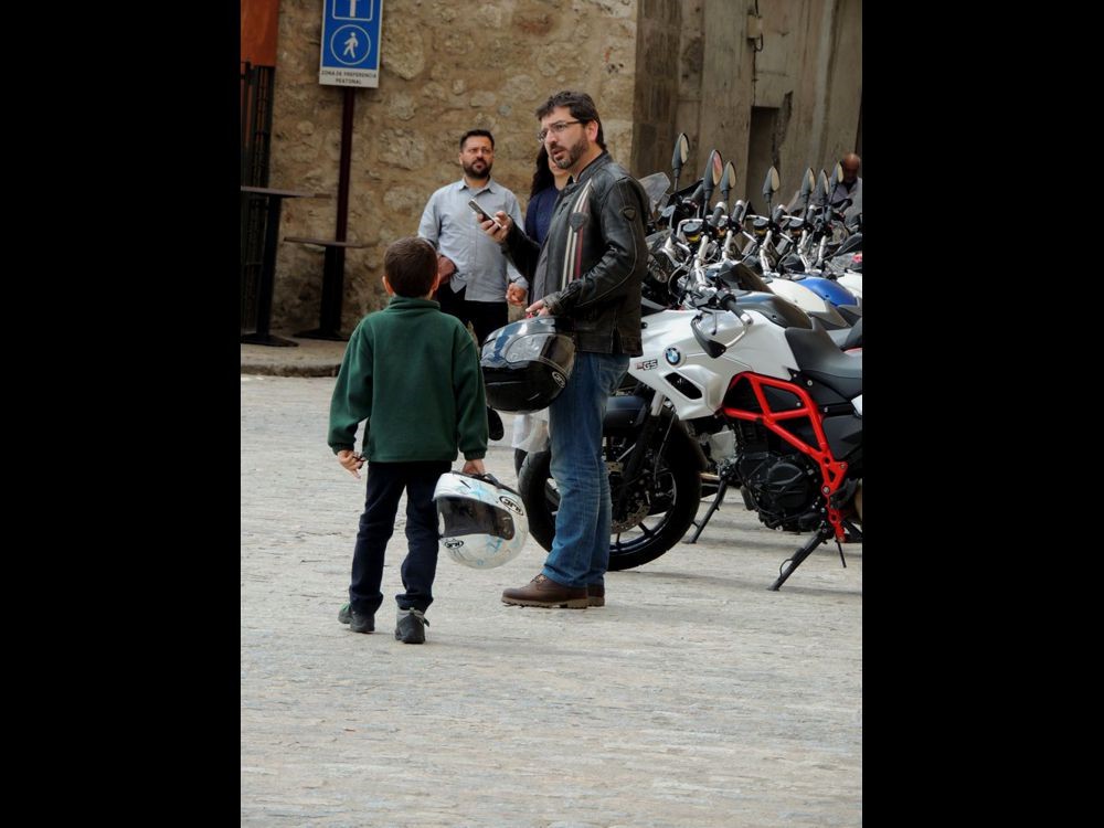 After lunch in a local bar, I noticed that the wedding wasn't the only event going on in the town that day. There was a little girl being confirmed (I asked), there was a large group of people socializing on the patio of a restaurant in the square, and there was SOME reason for a small group of people to be dressed in medieval clothing and hanging out on a balcony of the Hospederia Real De Pastrana in front of which we had parked. Then there was the father and son with motorcycle and helmets who parked their bike but took the time to check out some of ours before moving on.